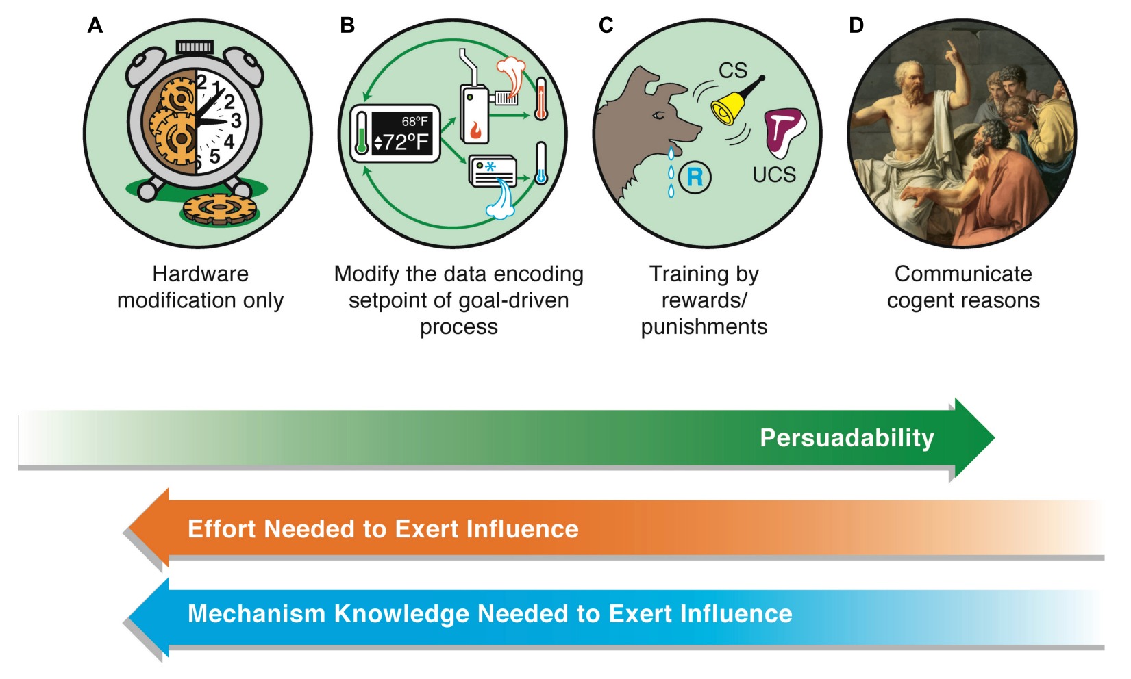 On the far left are the simplest physical systems, e.g., mechanical clocks (A). These cannot be persuaded, only physical hardware-level “rewiring” is possible if one wants to change their behavior. On the far right (D) are human beings whose behavior can be radically changed by a communication that encodes a rational argument that changes the motivation, planning, values, and commitment.