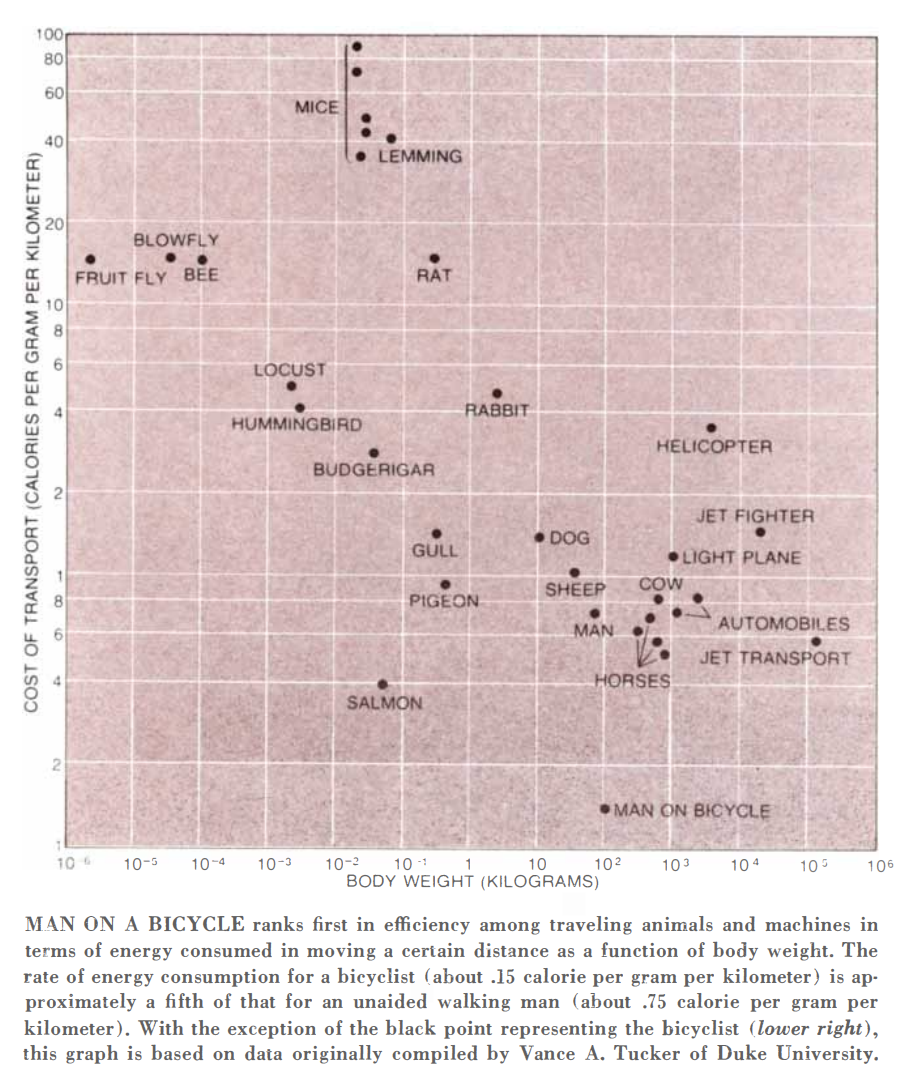 Chart of locomotion of animals. Scientific Amercian, Volume 228, Issue3. March 1973. p.90. MAN ON A BICYCLE ranks first in efficiency among traveling animals and machines in terms of energy consumed in moving a certain distance as a function of body weight. ... With the exception of the black point representing the bicyclist, this graph is based on data originally compiled by Vance A. Tucker of Duke University.