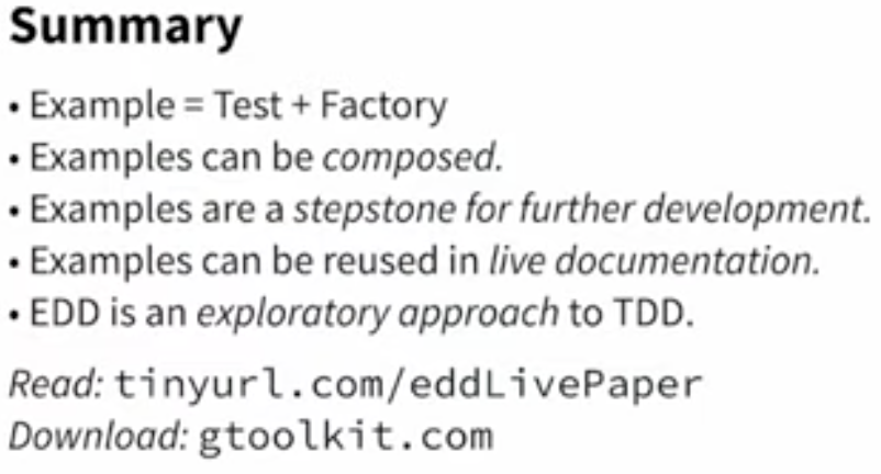 Example Driven Development in Glamorous Toolkit presented at SPLASH 2024. An example is a combination of a test and a factory.