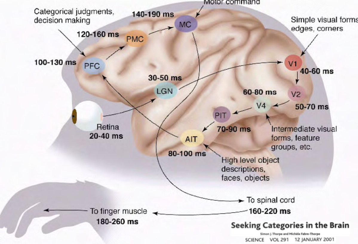 This is a great graphic by Simon Thorpe describing human visual cortex pipeline and latencies involved. twitter ![]()